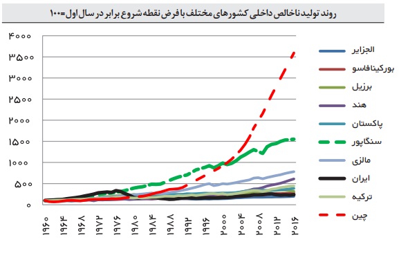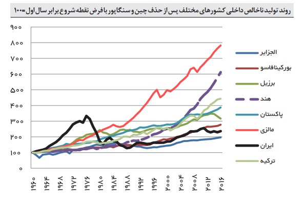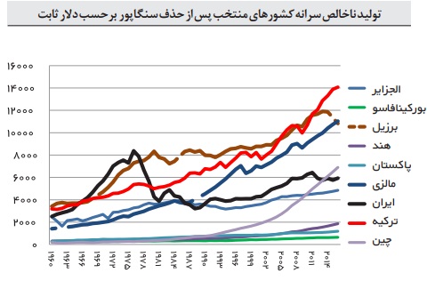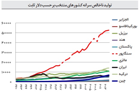 در نمودار 1 روند تولید ملی سرانه برخی کشورهای قابل‌مقایسه بین سال‌های 1960 تا 2016 برحسب دلار ثابت ترسیم‌شده است. مشخصاً برخی کشورها عملکرد بارزی داشته‌اند چنان‌که سایر کشورها در سایه قرار می‌گیرند. در این مورد نمونه سنگاپور قابل‌تشخیص است.