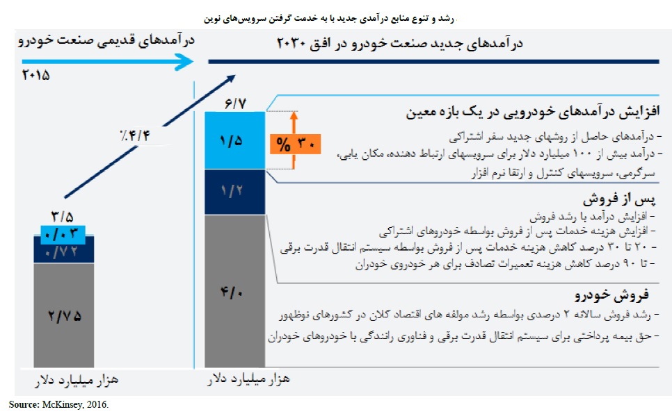 منابع درآمدي خودرو متأثر از رانندگي با روش هاي اشتراك گذاري سفر، سرويس هاي تبادل داده، ارتقاي فناوري و به كارگيري مدل هاي نوين كسب وكار تا سال 2030 ميلادي، حدود 1.5 تريليون دلار يعني معادل 30 درصد افزايش مي يابد.