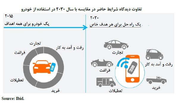 دورنماي اول: رانندگي با روش هاي اشتراك گذاري سفر، سرویس هاي تبادل داده در خودرو، ارتقاي فناوري و استفاده از مدل هاي نوين كسب و كار مي توانند منابع درآمدي خودرو را تا 30 درصد يعني چيزي حدود 1.5 تريليون دلار افزایش دهند.
