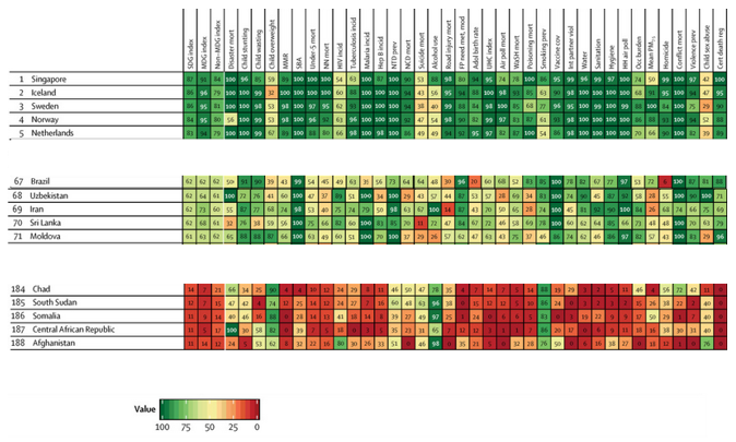 در مطالعه میزان پیشرفت اهداف توسعه پایدار بهداشتی در ۱۸۸ کشور جهان ( Measuring Progress and Projecting Attainment on the Basis of Past Trends of the Health-Related Sustainable Development Goals in 188 Countries: An Analysis From the Global Burden of Disease Study 2016) سی و هفت مورد از ۵۰ شاخص مربوط به SDG (اهداف توسعه پایدار) مربوط به سلامت طی سال های ۱۹۹۰ تا ۲۰۱۶ اندازه‌گیری شده‌اند.