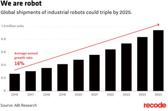 پيش بينى مى شود تعداد روبوتها با رشد سالانه ١٦٪ در بازه زمانى٢٠٢٥-٢٠١٦ ، در سال ٢٠٢٥، سه برابر شود.