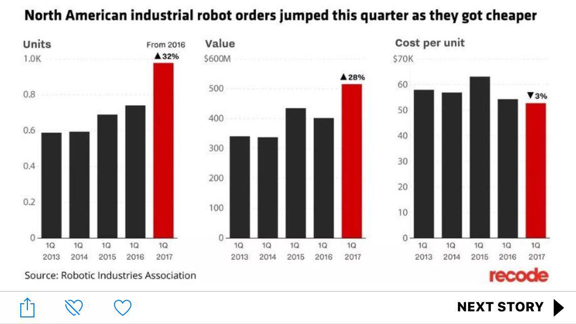 آمار انجمن صنايع روباتى RIA نشان مى دهد كه رشد فروش روباتها در فصل نخست ٢٠١٧ سرعت بيشترى يافته است.