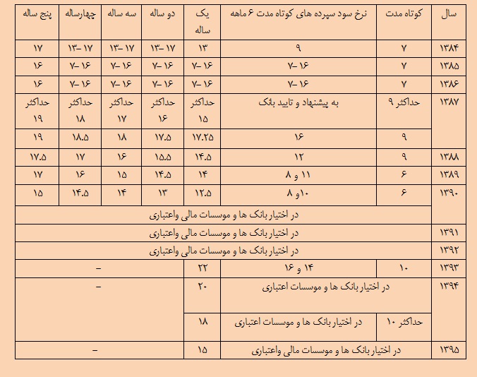 بانک مرکزی در جدیدترین ابلاغیه تمام بانک ها و مؤسسات اعتباری را مکلف به کاهش نرخ سود بانکی کرده است. براساس این ابلاغیه نرخ سود علیالحساب سرمایهگذاری مدتدار یکساله حداکثر 15 درصد و سپردههای کوتاهمدت حداکثر 10 درصد است. بانک باید دستورالعمل جدید نرخ سود بانکی را از 11 شهریورماه اجرا کنند. جدول زیر نرخ سود بانکی را در بیش از 10 سال گذشته نشان میدهد.