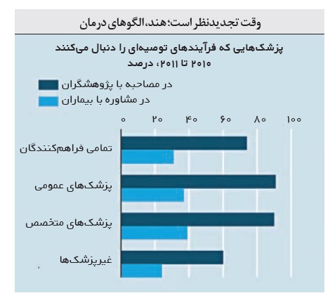 هند یکی از نمونههای قابل توجه است. هر روستاییِ هندی سالانه شش مرتبه به مطب دکتر مراجعه میکند. افراد ساکن شهر در هند نیز سالانه پنج مرتبه به پزشک مراجعه میکنند. این رقم برای امریکاییها به طور متوسط سه مرتبه است. هندیها نیازی نیست به جای دوری بروند تا دکتر را ببینند. آنها به دکتر دسترسی دارند. چین نیز وضعیت مشابهی دارد. پزشکها در زمینه درآمدهایشان مشکلاتی دارند که در نسخهپیچیهای آنها تأثیر میگذارد.