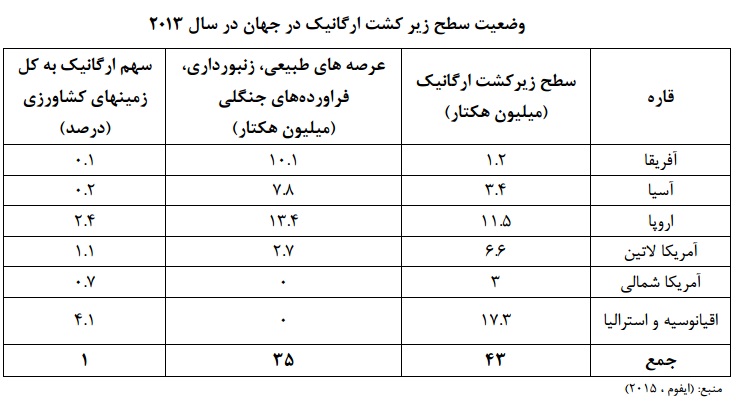 4 کشور آسیایی که بیشترین سطح زیر کشت را دارند چین، هند، فیلیپین و ویتنام هستند و 4 کشوری که کمترین میزان سطح زیر کشور را انجام میدهند، شامل ایران، امارات متحده، قرقیزستان و مالزی می شود. نکته مهمتر اینکه سطح زیر کشت ارگانیک ایران طی سالهای 2012 تا 2013 از 42634 هکتار به 12156 هکتار کاهشیافته است. کاهشی که معادل 30478 هکتار و 71.5 درصد میشود.